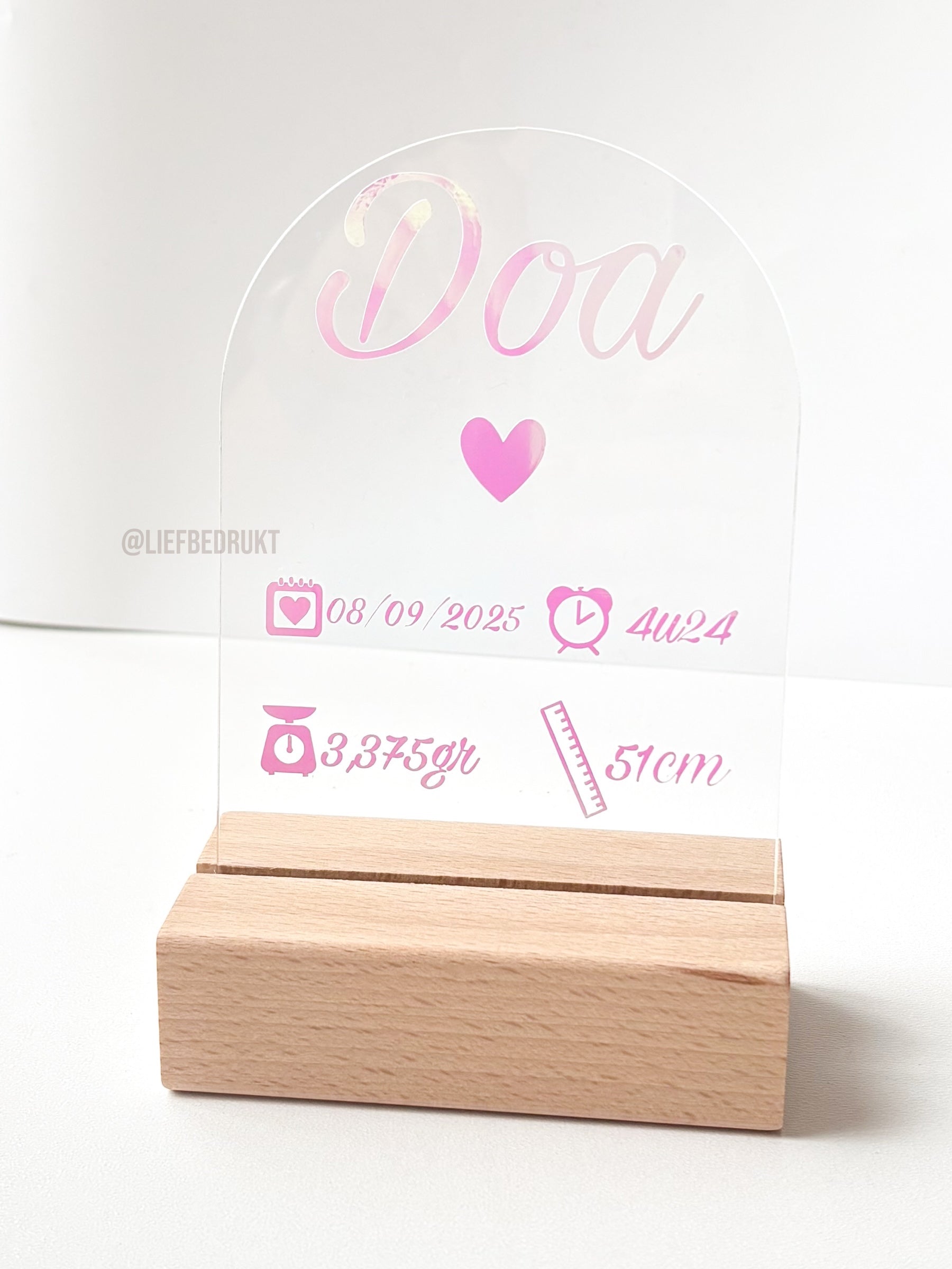 Vereeuwig de geboorte van jouw kleintje met onze unieke geboorteplaat! Gepersonaliseerd met naam, geboortedatum, tijd, gewicht en lengte – een uniek en stijlvol aandenken voor in de babykamer. Dankzij de meegeleverde staander zet je de geboorteplaat eenvoudig neer als decoratie.
