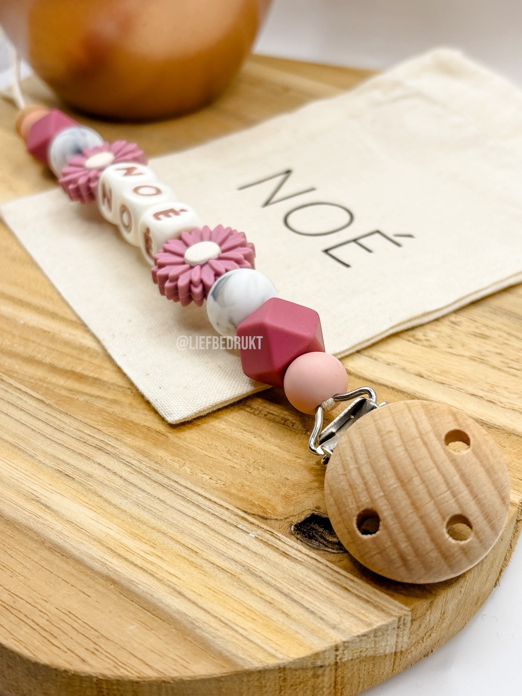 Kies zelf de naam of het woordje op het koord – ideaal als kraamcadeau of als unieke aanvulling op je eigen babyuitzet. Elk speenkoord is uniek en met liefde gemaakt.
